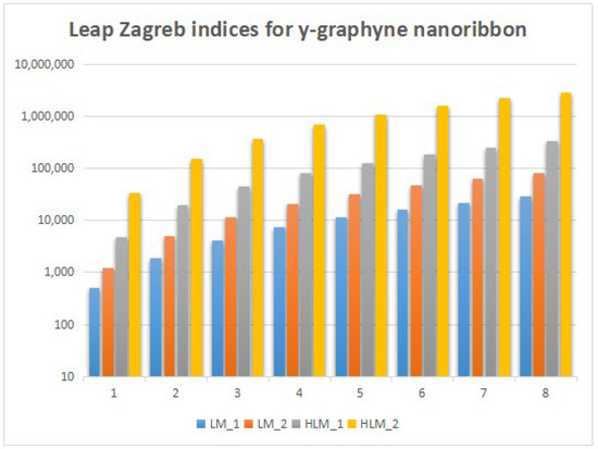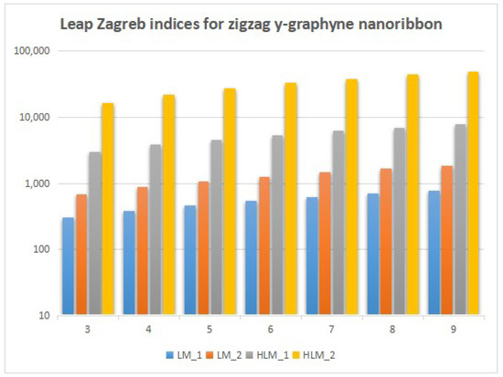 Logarithmic values of leap Zagreb indices for -graphyne nanoribbon.