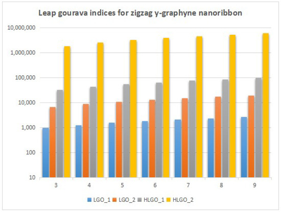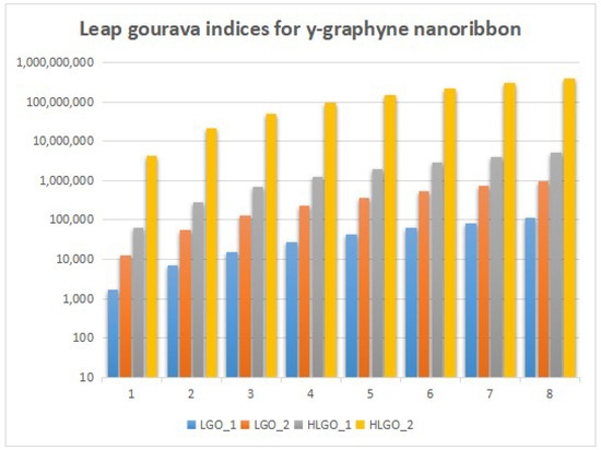 A comparative analysis of the figures shows that the hyper leap Zagreb index and hyper leap gourava index both attain the highest values as compared to the others for both the -graphyne nanoribbon and zigzag -graphyne nanoribbon. Molecular topology and connectivity are linked to the characteristics of molecules that are associated with the hyper leap Zagreb index and hyper leap gourava index. The hyper leap Zagreb index is used to describe the degree of branching and connectivity in a molecular structure. It provides information about the complexity and branching pattern of the molecular structure. A molecule’s connection and branching pattern are considered while using the hyper leap gourava Index. It provides information about the distribution of branching within the molecule and the spatial arrangement of atoms.