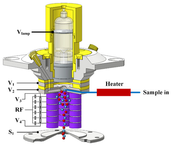 Figure 2 shows a 3D cross-sectional view of the CIFI ionization source; it is mainly composed of a VUV krypton lamp, a repulsion electrode, an extraction electrode, a sample inlet, a segmented quadrupole, and a differential vacuum orifice. The vacuum ultraviolet krypton lamp was sealed with the repulsion electrode via an O-ring, and the two were placed coaxially. The center of the repulsion electrode had a 10 mm hole with the same diameter as the light window of the VUV krypton lamp. The center aperture of the extraction electrode was 3 mm, which was conducive to the collision of photoelectrons sputtered from the metal surface of the extraction electrode by the vacuum ultraviolet krypton lamp with oxygen and water in the air under the acceleration of the electric field to generate reagent ions. The sample molecules and reagent ions then entered the segmented quadrupole under the effect of pressure and electric field, which produced chemical ionization between the reagent ions and the sample molecules. At the same time, with the continuous collision between ions and molecules, the energy of ions gradually decreased and converged on the central axis before passing through the differential vacuum orifice.