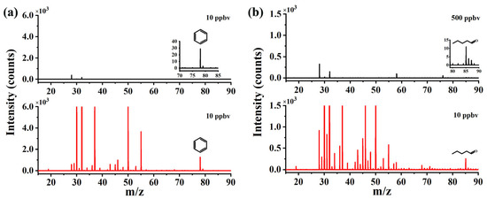 So, in Figure 3, we can observe that the intensities of O2+* and [(H2O)2 + H]+ are about 11,000 counts s−1 and 2100 counts s−1, respectively. The CIFI ionization source is a chemical ionization device, and benzene molecular ions [M]+* of C6H6+* are produced from SPI and CI with O2+* reagent ions. Pentanal is firstly ionized to form odd-electron ions, and it can further undergo hydrogen rupture at the carbonyl α-position to generate [M − H]+ ions of C5H9O+.