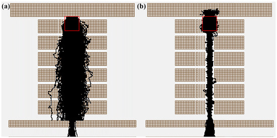 Ion trajectories of 100 Th ions with (a) RF on and (b) RF off (The red box represents the location of ions generation).