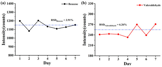 Average signal intensity of (a) benzene and (b) pentanal (10 ppbv) for 7 days (The dotted lines represent the average value of intensity).