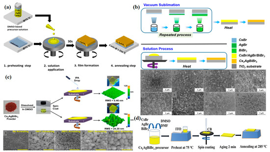 - Abdelsamie, M.; Cruse, K.; Tamura, N.; Ceder, G.; Sutter-Fella, C.M. Impact of processing conditions on the film formation of lead-free halide double perovskite Cs2AgBiBr6. J. Mater. Chem. A 2022, 10, 19868–19880. [Google Scholar] [CrossRef]