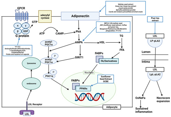 Schematic diagram of lipid metabolism and the effects of natural products. BBT, black soybean testa extract; LPL, lipoproteinlipase; HSL, hormone sensitive lipase; AMPK, adenosine monophosphate-activated protein kinase; NFC, Nigella sativa and Trigonella foenum graecum supplemented chapatis; LC-HS, Lippia citriodora L. and Hibiscus sabdariffa L; ASE, Aster spathulifolius Maxim extract; OPE, onion peel extract; CPT-1α, carnitine palmitoyltransferase I alpha; GCBE, green coffee bean extract; YY-312, Imperata cylindrica Beauvois, Citrus unshiu Markovich, and Evodia officinalis Dode; PPARα, peroxisome proliferator-activated receptor alpha; Lp-PLA2, lipoprotein-associated phospholipase A2; LDL, low-density lipoprotein; CoG, coconut oil group; SafG, safflower oil group; ChG, chia oil Group; GTP, guanosine triphosphate; ADRB3, A/T-, and β-adrenergic receptor 3; GPCR, G protein-coupled receptor; GTP, guanosine triphosphate; ATP, adenosine triphosphate; cAMP, cyclic adenosine monophosphate; AMPK, adenosine monophosphate-activated protein kinase; TG, triglycerides; FFA, free fatty acids; FABPs, fatty acid-binding protein; FA, fatty acid; OxNeFa, oxidized nonesterified fatty acids; PGC1α, peroxisome proliferator-activated receptor-gamma coactivator-1 alpha; PKA, protein kinase A; LpL-PLA2, lysophospholipid-associated phospholipase A2.