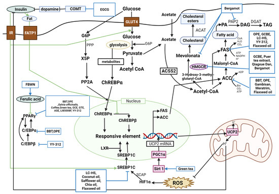 Schematic diagram of glucose metabolism and the effects of natural products. PPARγ, peroxisome proliferator-activated receptor gamma; BBT, black soybean testa extract; OPE, onion peel extract; GCBE, green coffee bean extract; GTE, green tea extract; ASE, Aster spathulifolius Maxim extract; LI85008F, Moringa oleifera leaf aqueous ethanol extract, Murraya koenigii (L.) Spreng. leaf aqueous ethanol extract, and Curcuma longa L. extract; YY-312, Imperata cylindrica Beauvois, Citrus unshiu Markovich, and Evodia officinalis Dode; ACC, acetyl-CoA carboxylase; ATP, adenosine triphosphate; ADP, adenosine diphosphate; C/EBPα, CCAAT-enhancer-binding protein alpha; FAS, fatty acid synthase; PA, phosphatidic acid; PAP2, type-2 phosphatidic acid phosphatase; DAG, diacylglycerol; DGAT, diacylglycerol-acyltransferase; TAG, triacylglycerol; LC-HS, Lippia citriodora L. and Hibiscus sabdariffa L.; NADPH, nicotinamide adenine dinucleotide phosphate; CoA, coenzyme A; C/EBPβ, CCAAT/enhancer-binding protein beta; HMGCR, HMG-CoA reductase; ACAT, acylCoA cholesterol acyl transferase; srebp-1c, sterol regulatory element-binding protein 1c; LXR, liver X receptor; FBWN, Lactobacillus plantarum fermented barley-wheat flour compound noodle; COMT, catechol-O-methyltransferase; IR, insulin receptor; FATP1, fatty acid transport protein 1; GLUT4, glucose transporter type 4; G6P, glucose-6-phosphate; Acetyl CoA, acetyl coenzyme A; ACSS2, acetyl-CoA synthetase 2; ChREBPα, carbohydrate response element binding protein α; ChREBPβ, carbohydrate response element binding protein β; UCP2, uncoupling protein 2; ROS, reactive oxygen species; HIF1α, hypoxia inducible factor 1; SCAP, stem cells from apical papilla; SIRT1, sirtuin-1; PGC-1α, peroxisome proliferator-activated receptor gamma coactivator 1-alpha; UCP2 mRNA, uncoupling protein 2 messenger RNA; PPP, phosphatidate phosphohydrolase; X5P, xylulose 5-phosphate; PP2A, protein phosphatase 2A.