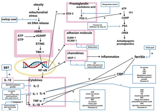 The nuclear factor-kappa B (NF-κB) signaling pathway was inhibited by AGE, GTE, GO, and juçara pulp powder, attenuating the production of proinflammatory cytokines and suppressing obesity-induced inflammation [9,41,50,51]. NF-κB inhibition decreases the circulating levels of proinflammatory cytokines, including tumor necrosis factor-α (TNF-α) and interleukin (IL)-6. IL-6 was decreased by AGE, BBT, a carob- and wakame-enriched snack, OPE, GTE, GO, juçara pulp powder, S. maxima extract, and flaxseed oil [9,11,13,22,41,50,51,53,71]. TNF-α was inhibited by AGE, BBT, artichoke extract, GSE, onion peel, GTE, GO, juçara pulp powder, S. platensis powder, and flaxseed oil [9,11,14,16,22,41,50,51,54,71]. Coffee and green tea, GO, and juçara pulp powder downregulated the expression of monocyte chemoattractant protein-1 (MCP-1), inhibiting monocyte adhesion [35,50,51]. Artichoke extract, GE, GSE, OPE, mangosteen extract, S. platensis powder, and flaxseed oil decreased high-sensitivity C-reactive protein (hsCRP) levels [14,15,16,22,52,54,71]. GO, canola oil, high-oleic-acid canola oil, and extra virgin olive oil reduced IL-1β [50,70,73]. BBT increased IL-10 [11]. Artichoke extract regulated IL-1 and interferon (IFN) [14]. Melinjo seed activated the cGMP-AMP (cGAMP) synthase-cGAMP-stimulator of interferon genes pathway by activating disulfide bond A oxidoreductase-like protein (DSBA-L) [20]. Onion peel decreased ferritin [22]. Watermelon decreased VCAM-1, intercellular adhesion molecule 1 (ICAM-1), and P-selectin, which attracts immune cells to damaged areas of the endothelium [29]. Mangosteen extract inhibited the conversion of arachidonic acid to prostaglandin E2 (PGE2) by altering cyclooxygenase (COX) and COX2 gene expression [52]. IL-2 was decreased by S. platensis powder [54]. Canola oil and high-oleic-acid canola oils inhibited inflammasome-mediated caspase-1 (CASP1) activity [73]. Coconut, safflower, and chia oils upregulated cAMP-dependent signaling pathways, which produce antiadipogenic prostaglandins that function in the adaptive reactions of cyclooxygenases [74].