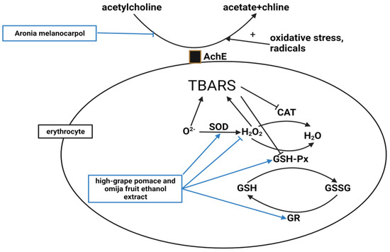 High oxidative stress and free radicals increase AChE activity. However, A. melanocarpa decreased the AChE activity in the erythrocyte membranes [46]. Superoxide dismutase (SOD) catalyzes the dismutation of the superoxide anion to H2O2, then catalase (CAT) and glutathione peroxidase (GSH-Px) degrade H2O2. GSH-Px also oxidizes reduced glutathione (GSH) to oxidized glutathione (GSSG), and GSSG is reduced to GSH by glutathione reductase (GR). A high-GO supplement elevated erythrocyte SOD, GSH-Px, and GR activities and lowered H2O2 levels [50]. Thiobarbituric acid reactive substances (TBARS), a marker of lipid peroxidation caused by oxidative injury, were also reduced by the high-GO supplement [50].
