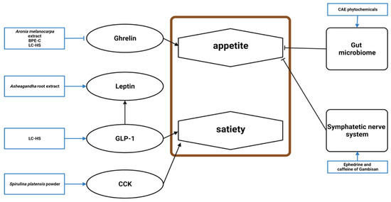 Ghrelin was lowered by A. melanocarpa extract, BPE-C, and LC-HS [46,48,62]. LC-HS increased glucagon-like peptide-1 (GLP-1), an anorexigenic incretin produced by the intestinal L-cells that stimulates insulin secretion and induces satiety [18,62]. Ashwagandha root extract reduced stress, restoring leptin levels, which suppresses food intake [56]. CAE phytochemicals, including limonene, γ-terpinene, trans-carveol, carvone, thymol, and carvacrol, improved the gastrointestinal microbiome to alter appetite [12]. The phenylalanine content of S. platensis powder may be responsible for cholecystokinin release, which affects the brain’s appetite center [54]. The ephedrine and caffeine in Gambisan reversed obesity by reducing food intake via the sympathetic nervous system [67].