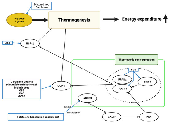 A carob- and wakame-enriched snack, melinjo seed, OPE, PGE, and GCBE induced uncoupling protein-1 (UCP1) in brown adipose [13,20,22,23,40]. ASE increased uncoupling protein-2 (UCP2) expression, increasing energy expenditure and consumption [57]. The sympathetic nervous system was considered related to energy expenditure through thermogenesis. Matured hop and Gambisan were believed to activate the nerve system [19,67]. PGE increased the expression of thermogenic-related genes, such as SIRT1, PPARα, and PGC-1α [23]. Folate and hazelnut oil capsules lowered ADRB3 gene methylation levels [72]. The ADRB3 protein facilitates the catecholamine-induced activation of adenylate cyclase through the actions of G proteins. These mechanisms are involved in energy homeostasis by mediating thermogenesis.