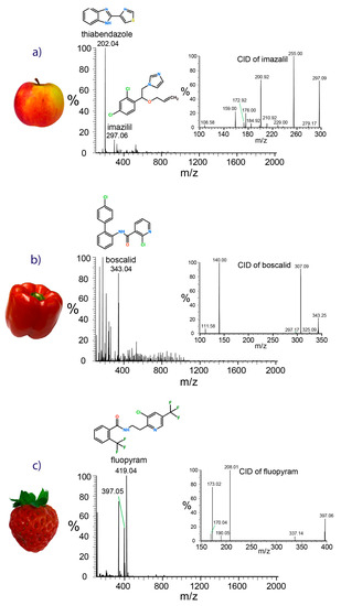 Full-scan swab spray mass spectra of samples taken from the skin of an apple harvested in Switzerland (a), a bell pepper from Spain (b), and strawberry leaves from Switzerland (c), showing the peaks of fungicides. Evidence for compound identities is given by the exact masses, the isotopic patterns, and the product ion spectra (insets).