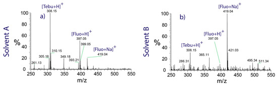 However, the extent of sodium adduct formation was found to be affected by the choice of the solvent, as well. The spectrum in Figure 3a was recorded using solvent A, which contains 70% ethyl acetate. Analyte molecules compete with excess ethyl acetate molecules for the available sodium ions, which limits the degree of analyte-sodium adduct formation. In contrast, the spectrum shown in Figure 3b was recorded using methanol as the solvent. Methanol exhibits a lower affinity towards sodium ions and causes fluopyram to be detected almost exclusively in sodiated form.
