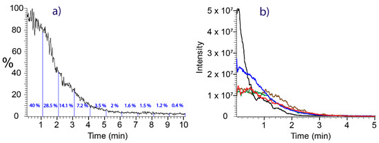 (a) Depletion curve (XIC m/z 342.9–343.2) of the boscalid [M+H]+ ion sampled from the skin of a bell pepper. The sections show fractions of material depleted within time slots of 60 s. (b) Depletion curves of imazalil reference material (XIC m/z 297.01–297.10) recorded after spiking 100 ng imazalil dissolved in 4 µL solvent A on swabs. The overlay of five differently colored curves demonstrates the variations in curve shape.