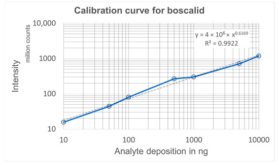 Calibration curves: For establishing a calibration curve, prewashed swabs were spiked with 2 µL boscalid reference material at concentrations of 5, 25, 50, 250, 500, 2500, and 5000 ng/µL, resulting in depots of 10, 50, 100, 500, 1000, 5000, and 10,000 ng, respectively. Analyses were performed with solvent A continuously fed to the swab heads at a flow rate of 45 µL/min. The areas under the extracted ion current traces (m/z 342.90–343.20) of the boscalid proton adduct were considered for establishing the calibration curve (Figure 5, Supplementary Data S3). As the integration time intervals were dependent on the depletion kinetics, a 5 min range was chosen for depots up to 1000 ng and a 10 min range for the two larger depots. The LOD was determined using visual evaluation and the Thermo Fisher Scientific Xcalibur genesis algorithm was applied to calculate the RMS signal-to-noise ratio. The limit of detection (LOD) of boscalid was found to be 5 ng (S/N RMS: 82) and the limit of quantitation was 10 ng. The LODs of imazalil and thiabendazole corresponded to 1 ng (S/N RMS: 196) and 2 ng (S/N RMS: 145), respectively (Supplementary Data S4).
