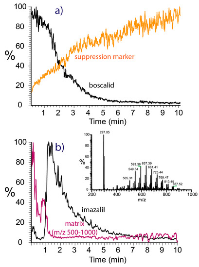 The data for the fungicide imazalil were recorded from an orange peel sample, harvested in Spain, and demonstrate the suppression of the analyte by strong matrix constituents (Figure 6b). In addition to imazalil, polyethylene glycol (PEG) was found on orange peel, a compound added by the food industry as a coating agent for extending the post-harvest shelf-life of fruit [43,44]. The PEG signal detected in the range from m/z 500 to 1000 led to a massive suppression of the ionization of imazalil. The depletion of PEG was found to be rapid and the suppression of the fungicide was significant during the first minute of analysis only. However, the non-simultaneous extraction of analyte and PEG require further investigation to understand the extraction kinetics of analytes of different polarities.