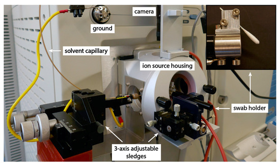 Modified nanoelectrospray ion source with the swab holder and the solvent capillary mounted on 3-axis translation stages for exact positioning. The inset shows the mounting position of the swab.
