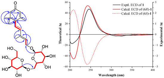 Compound 1 was isolated as a colorless gum, which had a molecular formula of C27H42O12 as deduced from an HRMS (ESI) pseudo ion peak at 581.2564 [M + Na]+ (calcd. for C35H58O9Na, 581.2569). The IR spectrum showed absorption bands for carbonyl (1656 cm−1) and double bond (1635 cm−1) functional groups. The 1H-NMR spectrum (Table 1) of 1 exhibited two methyl singlets linked to aliphatic carbons at δH 0.98 and 1.04, and two methyl singlets linked to double bonds at δH 1.82 and 1.93, as well as two anomeric hydrogens of glycosides at δH 4.31 (1H, d, J = 8.1 Hz) and 4.39 (1H, d, J = 7.8 Hz). Two intercoupled olefinic protons at δH 6.28 (1H, d, J = 15.5 Hz) and 5.64 (1H, dd, J = 15.5, 9.5 Hz) indicated a trans C-CH=CH-CH group. Two other olefinic hydrogens resonated at δH 5.69 (1H, dd, J = 7.3, 6.4 Hz) and 5.90 (1H, s) indicating the existence of two double bonds. The 13C-NMR (Table 1) and DEPT (135) spectra revealed a carbonyl group at δC 202.1, four olefinic methine at δC 139.3, 128.5, 127.3, and 126.0, four methyls at δC 28.1, 27.5, 23.8, and 13.1, as well as two anomeric carbons at δC 104.9 and 103.4. The above information revealed a sesquiterpenoid di-glycoside structure for 1, similar to that of (R)-dehydroxyabscisic alcohol β-d-apiofuranosyl-(1″→6′)-β-d-glucopyranoside [28]. On the HMBC spectrum, correlations from the geminal dimethyl H3-14 and H3-15 to C-1, C-2, and C-6, from H3-13 to C-5, C-4, and C-6, from H2-2 to C-3, C-4, and C-6, and from H-4 to C-6 revealed the trimethyl α,β-unsaturated cyclohexanone moiety. HMBC correlations from H-7 and H-8 to C-6, from H3-12 to C-9, C-8, and C-10, from H-10 to C-8, and from H2-11 to C-9 and C-10 then indicated the conjugated double bonds sidechain linked to C-6. For the di-hexose moiety, 1H-1H COSY first allowed the confirmation of two independent glucoside chain and key HMBC correlations of H-1″/CH2-6′ and H-1′/CH2-11 then identified the connectivity as shown in Figure 2. NOESY correlations of H3-12/H2-11 and H-8/H-10 revealed the trans-configuration of C-9−C-10 double bond. Furthermore, acid hydrolysis of 1 and subsequent acetylation and GC analysis showed that the hexose was identical to an authentic sample of D-glucose. The absolute configuration at C-6 was identified by quantum chemical calculation of the theoretical ECD spectrum and compared with the experimental one. As shown in Figure 2, both the theoretical ECD spectrum for 6R-1 and the experimental ECD spectrum showed the first small negative Cotton effect around 300–350 nm and a positive one around 250 nm, while the Cotton effects of the theoretical ECD spectra for 6S-1 showed opposite signs to the experimental data, which indicated a 6R configuration for 1. Therefore, the structure of compound 1 was deduced as ®-dehydroxyabscisic alcohol-β-d-glucosyl(1→6)-β-d-glucopyranoside.