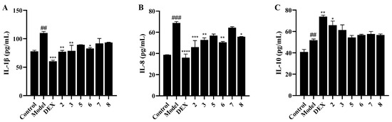Effects of compounds 2, 3, 5–8 on cytokine release levels in TNF-α induced A549 cell inflammation. (A) Release level of IL-1β. (B) Release level of IL-8. (C) Release level of IL-10. ## p < 0.01. vs. Control group; ### p < 0.001. vs. Control group; * p < 0.05. vs. Model group; ** p < 0.01. vs. Model group; *** p < 0.001. vs. Model group; **** p < 0.0001. vs. Model group.
