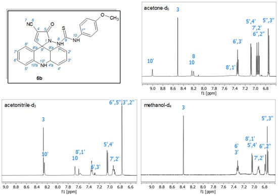1H NMR (600 MHz) spectra of derivative 6b in acetone-d6, acetonitrile-d3, and methanol-d4.