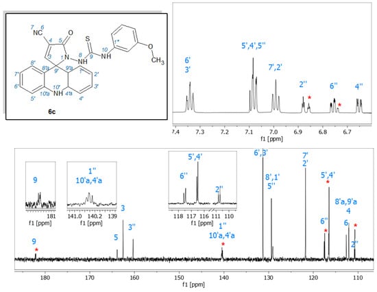 1H (600 MHz, acetone-d6) and 13C NMR (150 MHz, acetone-d6) spectra of derivative 6c. Red stars indicate doubled signals.