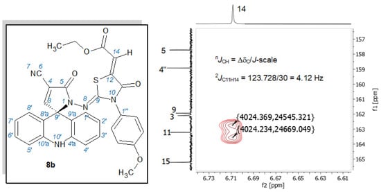 The geometry of the C9=N8 double bond was not determined using NMR experiments due to sparse proton data. However, based on previous knowledge and experience [28], it was assumed that the reactions produce ZC9=N8-isomers, as the Z-configuration is sterically more favorable. The geometric configuration of the C12=C14 double bond was resolved based on heteronuclear coupling constants extracted from EXSIDE spectra (Figure 6) [30], indicating that the C12=C14 double bond in isomers 8a–e exists in the Z-configuration [28], with coupling constants 3JC11/H14 ranging from 3.54 to 5.11 Hz (Table 1).