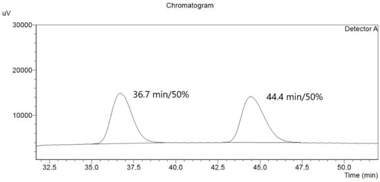 To resolve the enantiomeric derivatives 9 and 10, chiral HPLC was employed. The results are summarized in Table 2, and Figure 7 illustrates a representative HPLC chromatogram. In most cases, two peaks of equal intensity were observed, indicating the presence of a racemic mixture comprising two enantiomers. However, enantioseparation could not be achieved for derivatives 9b and 10b due to their insolubility in common HPLC solvents compatible with the used chiral column, thus hindering the determination of their enantiomeric purity. Baseline enantioseparation and successful chiral recognition were achieved for derivatives 10a and 10c–d, using the Chiralpak IA column and n-hexane/acetone as the mobile phase. On the other hand, the enantiomeric separation of 9a was unsuccessful due to signal overlap, though the peak’s shape suggested the presence of both enantiomers. Despite attempts to optimize conditions by varying the mobile phase, temperature, or flow rate, the signal resolution could not be improved. Based on the similarity with other measured samples, we infer that they also exist as racemic mixtures. While some samples exhibited a poorer signal resolution, all the measured compounds were considered racemic mixtures.
