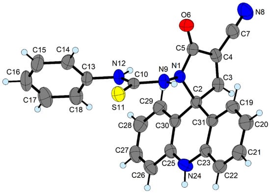 The structure of 6a was initially determined from NMR data and further confirmed by single-crystal X-ray structure analysis. The crystal structure of 6a·AC (Appendix A) revealed that it crystalizes in the monoclinic space group P21/c. In the solid state, it comprises a 3-{4′-cyano-5′-oxo-1′,5′-dihydro-10H-spiro[acridine-9,2′-pyrrol]-1′-yl]-1-phenyltiourea molecule (6a) and a solvated acetone molecule (AC) connected to 6a through a hydrogen bond. Figure 9 illustrates that the 6a molecule consists of three linked rings, with none of them being coplanar with each other. The planar phenyl and pyrrole rings are joined by a thiourea linker, forming an angle of 60.92(7)°. In accordance with our previous results [23], the dihydroacridine moiety in 6a is nearly planar. On the other hand, in a related 1-[(E)-[(4″-bromophenyl)methylidene]amino]-5-oxo-1,5-dihydro-10′H-spiro[acridine-9′,2-pyrrole]-4-carbonitrile compound [31], the dihydroacridine moiety is slightly parabolically curved as was also observed in some structures of dihydroacridines [32]. The mean plane of the dihydroacridine moiety in 6a is in a nearly orthogonal position towards the pyrrole ring (87.52(4)°), partially due to the steric repulsion between the two mentioned systems and partially due to the sp3 hybridized C2 atom that is shared by both systems and links them. Finally, the angle of the mean planes passing through the phenyl and acridine units is 74.55(6)°. The bond lengths and angles (Table 3) characterizing the geometry of the dihydroacridine, phenyl, and pyrrole moieties in 6a are similar to those found in the earlier investigated compounds with the corresponding rings [32,33]. Similarly, the bond lengths of the C=O and C–C≡N bonds and the bonds within the thiourea linker and the acetone molecule are within the usual lengths for such bonds [34].