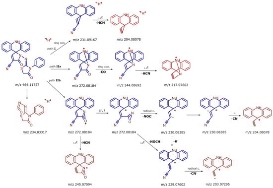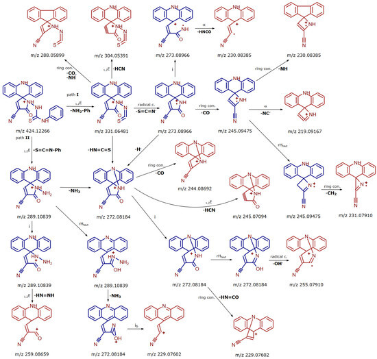 A new π-bond was formed between C=N with the subsequent neutral loss of the entire system containing the thiazolidine-4-one and phenyl rings. The formation of the fragment ion with m/z 272.08184 (80%) was presumed to involve a transition state where the vacant orbital, being formed on N-1 during the heterolytic cleavage of the N1–N8 bond, was stabilized through interaction with the lone pair of acridine nitrogen N-10′ (Figure 12, path IIa) or oxygen in pyrrole (path IIb). As this ion was considerably intense for all compounds 7–10, it is likely that the formation of ion m/z 272.0818 required a relatively low activation barrier, making it a kinetically favored process.