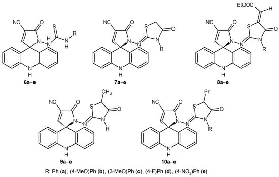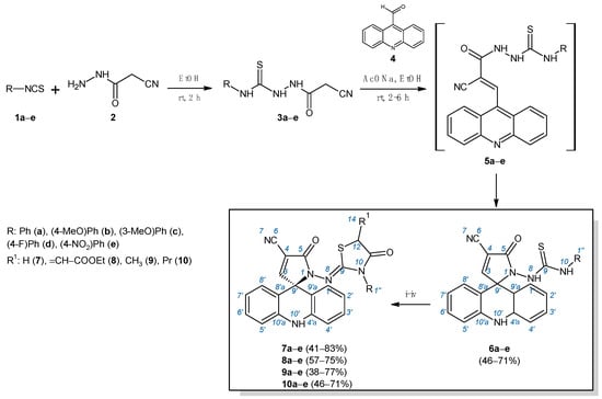 The synthesis of derivatives 6a–e involved the reaction of the respective cyanoacetohydrazides 3a–e with acridine-9-carbaldehyde (4) [22], as depicted in Scheme 1. The first step involved the synthesis of hydrazides 3a–e, which were prepared from commercially available isothiocyanates 1a–e and 2-cyanoacetohydrazide (2) in ethanol at room temperature. The second step entailed the synthesis of spiro derivatives 6a–e. Acridine-9-carbaldehyde (4) was allowed to react with the appropriate hydrazides 3a–e, catalyzed by sodium acetate in dry ethanol at room temperature. The compounds were subsequently purified by crystallization from acetone. The final yields of purified spiro compounds 6a–e, expressed in terms of starting acridine-9-carbaldehyde (4), ranged from 59 to 74%. Intermediates 6a–e were subjected to modifications using bifunctional reagents MBA, DEAD, EBP, and EBV. Almost all reactions were conducted in the presence of Et3N in ethanol, except for the reaction of 6e with MBA, which was realized in the presence of anhydrous sodium acetate at 70 °C in ethanol. The target molecules 7–10 were obtained with moderate yields ranging from 38 to 83% (Scheme 1). The synthesized compounds underwent further analysis using high-field NMR techniques.