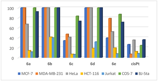 Graph representing the IC50 values of compounds 6a–e against MCF-7, MDA-MB-231, HeLa, HCT-116, Jurkat, COS-7, and BJ-5ta cell lines, indicating that 6c and 6e are the most potent cytotoxic agents in this series using cisPt as the standard drug.