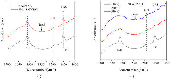 Py-IR was used to further investigate the types of acid sites. In Figure 3c, the peaks at 1611 and 1451 cm−1 were assigned to the interaction between pyridine and Lewis acid sites, and the peak at 1491 cm−1 was attributed to the Lewis and Brønsted acid sites [37]. No Brønsted acid sites were detected on the ZnZr/SiO2 and 1%L-ZnZr/SiO2 catalysts; only Lewis acid sites were observed. The number of Lewis acid sites in the two catalysts is listed in Table 1. ZnZr/SiO2 possessed a higher number of Lewis acid sites than 1%L-ZnZr/SiO2. In Figure 3d, it can be observed that when the pyridine FT-IR desorption temperature is higher than 250 °C, the peak intensity declines dramatically. These results indicate that 1%L-ZnZr/SiO2 has a smaller number of Lewis acid sites, which probably promotes the aldol condensation and MPV reduction steps in the direct ETB process [38].