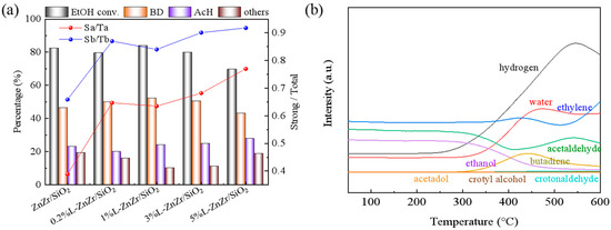 (a) Relationship between acid–base properties and catalytic performance for direct ETB conversion; (b) ethanol-TPSR profiles for direct ETB conversion in the 1%L-ZnZr/SiO2 catalyst.