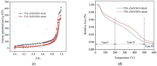 A long-term stability experiment was performed on the 1%L-ZnZr/SiO2 catalyst, and the results are shown in Figure 6a. The ethanol conversion and butadiene selectivity remained relatively stable for over 50 h in the reaction test. The ethanol conversion and the selectivity of BD declined slightly from 84.8 to 77.9% and from 52.7 to 41.2%, respectively. To further study the deactivation mechanism of the catalyst, we characterized the spent catalysts with various characterization techniques. In Figure 6b, compared with the fresh 1%L-ZnZr/SiO2 catalyst, the XRD pattern of the spent 1%L-ZnZr/SiO2 catalyst shows no obvious difference. However, the N2 adsorption–desorption isotherms of the fresh and spent catalysts are demonstrably changed (Figure 6c). The specific surface area and total volume of the spent 1%L-ZnZr/SiO2 catalyst decreased (Table S4), which may be due to some mesopores of the 1%L-ZnZr/SiO2 catalyst being partially blocked by the high carbon products and carbon deposits. A further TG analysis showed that the first stage (type I: 0–200 °C) primarily involves volatile substances such as water. In the second stage (type II: 200–500 °C), the primary process involves the thermal decomposition or carbonization of carbonaceous compounds within the sample. It is obvious that the spent 1%L-ZnZr/SiO2 catalyst showed a significant weight loss at around 450 °C compared with the fresh 1%L-ZnZr/SiO2 catalyst, indicating that the high carbon products and carbon deposits were formed during the long-term stability test of the direct ETB reaction. In the third stage (type III: above 500 °C), there is minimal thermal change, suggesting that the carbonaceous deposits have largely decomposed or completed carbonization.