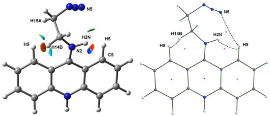 According to the analysis of non-covalent interactions based on the reduced density gradient (RDG) and sign (λ2)·ρ (r) functions [49] (λ2—intermediate eigenvalue of electron density Hessian), there are a number of regions having low RDG values, which indicate the presence of non-covalent interactions in the area between the substituent and the acridine moiety. In particular, the RDG/sign (λ2)·ρ (r) plot (Figure S2) and the corresponding 3D isosurface plot (Figure 2, left) demonstrates the regions potentially having (1) rather strong non-covalent interactions between the H2N and H5 atoms and between the H9 and H14B atoms (the negative λ2 sign corresponds to the accumulation of electron density), (2) weak Van der Waals interaction between the N5 and H5 atoms, and (3) forced interactions between the H9 and H15A atoms, between the H9 and N2 atoms, and between the N2 and C5 atoms, all formed due to steric effects (the positive λ2 sign corresponds to the electronic charge depletion). The bonding nature of the dihydrogen H2N…H5 and H9…H14B contacts as well as of the weak N5…H5 contact is confirmed by the presence of (3, −1) critical points of electron density between corresponding topological atoms (Figure 2, right) that is the real space manifestation of preferred exchange–interaction channels [50,51]. Note that the net energy of these bonding non-covalent interactions estimated from the interatomic surface integrals of electron density [52] equals −7.1 kcal·mol−1, which is in exceptionally good agreement with the loss of energy occurring upon the distortion of acridine moiety conformation (see above). The main contribution (−3.6 and −3.2 kcal·mol−1) arises from the dihydrogen bonds, whereas the energy of C-H…N interaction is less than 0.3 kcal·mol−1 in magnitude. Thus, the steric repulsion between the substituent and acridine fragments leading to the pronounced distortion of the aromatic fragment is compensated by two dihydrogen bonds.