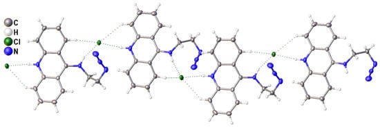 Finally, the crystal packing of 2 is expected, considering the presence of two strong proton donors in the cation. Namely, cation moieties are aggregated into the infinite chains by rather strong H-bonds between the N-H groups and chloride anions (N…Cl 3.131 and 3.156 Å, ∠ (NHCl) with the normalization of N-H bond lengths 171.3° and 156.4°, Figure 3). Due to their geometry, these H-bonds, together with weaker C-H…Cl contacts, can additionally stabilize the distorted structure of the cation. The abovementioned chains are bound together through numerous weaker interactions such as π…π stacking interactions between acridine moieties, C-H…Cl hydrogen bonds, and C-H…π interactions.