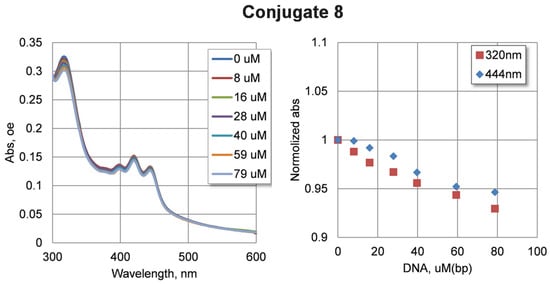 In order to test the ability of the compounds to bind DNA, spectral changes were tested through increasing the concentration of DNA in solution. Due to the low solubility of the compounds, a concentration of 5 µM was used. Calf thymus DNA at concentrations of up to 80 µM was added to the solution of compounds. The changes in the absorption spectra of compounds 7–10 are shown in Figure S5 (see Supplementary Materials). It can be seen that increasing the concentration of DNA in the solution leads to a non-significant decrease in absorbance. Changes in the absorbance of compounds 7–10 were not significant: about 5% taking into account dilution during titration. Such changes may characterize the relatively weak binding of the studied compounds with DNA under experimental conditions. The largest spectral changes were observed for conjugate 8 (Figure 5).