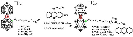 The obtained N9-azidooacridine 2 was used for the synthesis of target conjugates of cobalt bis(dicarbollide) with acridine 7–10 (Scheme 2). The acetylenic derivatives of cobalt bis(dicarbollide) 3–6 were prepared through the nucleophilic cleavage reactions of the corresponding cyclic oxonium derivatives of cobalt bis(dicarbollide) with 2-propyn-1-ol and 3-butyn-1-ol [40,54]. The “click” reactions were carried out refluxing boron-containing acetylenic derivatives 3–6 with the N9-azidoacridine 2 in ethanol for 2 h in the presence of CuI and diisopropylethylamine (DIPEA). The desired triazoles 7–10 were isolated as cesium salts via precipitation with CsCl from aqueous acetone followed by column chromatography on silica using a CH2Cl2-CH3CN mixture (70–75%) as eluent.