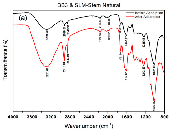 As shown in Figure 3a, the FTIR-ATR spectra comparison of the SLM Stem-Natural before and after the BB3 dye adsorption process showed that the peak at 3289 cm−1 remained unchanged, whereas the peaks at 2916 cm−1 and 2850 cm−1 became more intense in the post-adsorption spectrum. Furthermore, the peaks at 2160 cm−1, 2029 cm−1, 1979 cm−1, and 1609 cm−1 were unchanged, whereas the peak at 1732 cm−1 became sharper and more intense in the post-adsorption spectrum. Additionally, the peaks at 1436 cm−1 and 1154 cm−1 were more robust and sharper in the post-adsorption spectrum compared with the pre-adsorption spectrum.