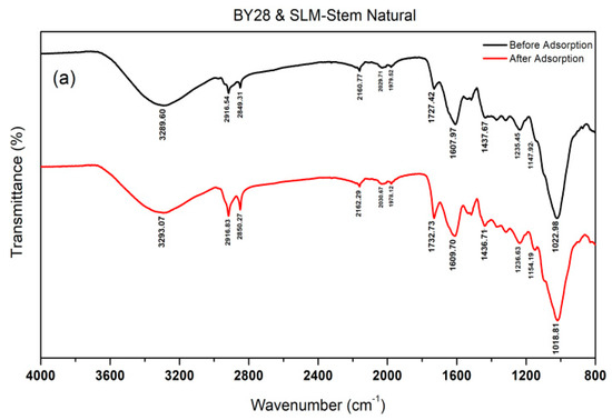 The FTIR−ATR spectra of before and after adsorption of BY28 on SLM Stem-Natural (a) and SLM Stem-800 °C (b).