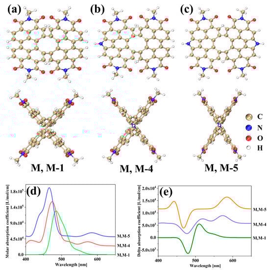 Scientists have recently been paying attention to the development of new molecular carbon materials that have excellent properties in optical, electrical, and magnetic aspects, which are combined with good processing performance and stability. In 2022, Wang et al. reported a double π-helix structure that was based on a cyclooctatetraene-embedded PDI dimer with D2 symmetry [28]. Figure 1a–c shows the schematic structures and side views of the three molecules, while Figure 1d displays the UV–vis spectrum. Figure S1a indicates that there is no nitrogen heterocycle at the bay region in the M, M-1 structure. It also shows that the positions of S1 and S2 excited states are closer. In the M, M-4 structure, a nitrogen heterocycle is added at the bay position, creating a pyrrole. This results in a red shift in the absorption peak for the S1 excited state and a blue shift in the absorption peak for S2. The S1 and S2 excited states become more separated, causing a new absorption peak to appear and an increase in absorption intensity. In the M, M-5 structure, two nitrogen heterocycles are added at the bay, causing the formation of two pyrroles. The distribution of excited states S1 and S2 is comparable to that of the M, M-4 structures, and new absorption peaks are visible, as shown in Figure S1c. The intensity of absorption in the S2 excited state decreases. The emergence of a new peak in the UV–vis absorption spectrum is directly linked to the introduction of nitrogen. The introduction of nitrogen heterocycles in the bay position can cause the splitting of excited states, leading to the creation of new absorption peaks.