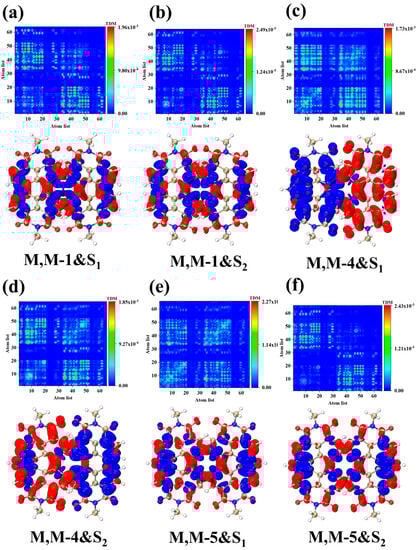 Due to the difference in absorption intensity and the splitting of the absorption peaks, the charge transfer in the S1 and S2 excited states is necessarily affected by the appearance of new absorption peaks. Therefore, the study was carried out with the S1 and S2 excited states corresponding to the two split absorption peaks. Figure 2 shows the TDM and CDD plots of S1 and S2 excited states for three structures. As can be seen from the CDD plots of structure M, M-1 in S1 and S2 excited states (Figure 2a,b), the distributions of electron and hole densities are roughly left-right symmetric, which depends on the symmetry of the M, M-1 structure itself. It is apparent from the TDM diagram that charge-transfer excitations dominate both excited states, as the transition densities are mainly in the off-diagonal region. From the CDD plots of structure M, M-4 in S1 and S2 excited states (Figure 2c,d), the electrons of S1 are mostly distributed in the right segment of the structure and the holes are mostly distributed in the left segment of the structure, while the distribution of electron-hole density in S2 excited states is opposite to that of S1. The electron and hole densities of the two excited states are separated from left to right. This is caused by the disruption of the molecule’s symmetry after the nitrogen heterocycle is introduced at the bay position, which leads to different electronic excitation behavior. Combined with the TDM diagram, it can be seen that the transition densities of S1 and S2 excited states appear mainly in the non-diagonal region, with only a small amount of transition densities at the diagonal, which indicates that both excited states are dominated by charge transfer excitations accompanied by weak local excitations. By investigating the CDD plots of structures M, M-5 in their respective S1 and S2 excited states (Figure 2e,f), it is apparent that the distribution of electrons and holes returns to a symmetric pattern from left to right. This is a result of the introduction of two nitrogen heterocycles in the bay position, which restore symmetry to the molecule’s structure.