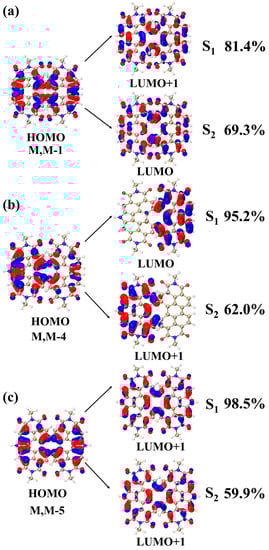The excitation modes of the S1 and S2 excited states are analyzed based on their TDM and CDD diagrams. It can be seen that the appearance of a new absorption peak has an impact on the excited state charge transfer, which is necessarily also reflected in the main contributing orbitals of these three molecules in S1 and S2. To better investigate the electronic transition patterns caused by the change of molecular spatial structure, the main contributing orbitals of the excited states of the three structures are analyzed next to corroborate the above conclusions. In Figure 3, the electron cloud distribution of the primary orbitals that contribute to the S1 and S2 excited states for the three structures are displayed (with the remaining orbitals depicted in Figure S2). Additionally, Table 1 presents the percentage of the primary contributing orbitals of the S1 and S2 excited states (>1%) for the three structures. As shown in Figure 3a, the contribution of HOMO to LUMO+1 in the S1 excited state of the M, M-1 structure is 81.4%, and the contribution of HOMO to LUMO in the S2 excited state is 63.9%. Due to the symmetry of M, M-1 structure, the distribution of LUMO+1 electron cloud is also relatively symmetrical. Compared with HOMO, the position of the electron cloud distribution of LUMO and LUMO+1 has changed. The positions of the electron clouds for LUMO+1 and LUMO are complementary to HOMO. The colors of the upper-left and lower-right regions in LUMO+1 and the lower half of LUMO are opposite to those of HOMO. This suggests that the S0→S1 and S0→S2 transition processes are charge-transfer excitations with distinct transition characteristics. In Figure 3b, the contribution of HOMO to LUMO in the S1 excited state of the M, M-4 structure is 95.2% and the contribution of HOMO to LUMO+1 in the S2 excited state is 62.0%. After introducing the nitrogen heterocycle at the bay position, the symmetry of the molecule was broken, resulting in a significant change in the electron cloud distribution of LUMO and LUMO+1 compared to HOMO. As shown in Figure 3b, the electron clouds of HOMO are distributed on the left and right sides of the structure, while the electron clouds of LUMO are distributed on the right segment of the structure and the electron clouds of LUMO+1 are distributed on the left segment of the structure. During the charge transfer excitation from S0→S1 and S0→S2, the distribution of electron clouds is deflected, indicating a disruption in the structure’s symmetry. In Figure 3c, the contribution from HOMO to LUMO+1 in S1 excited state of M, M-5 structure is 98.5%, and the contribution from HOMO to LUMO+1 in S2 excited state is 59.9%. After introducing two nitrogen heterocycles at the bay position, the structure becomes symmetric, and electron cloud distribution is roughly left-right symmetric. The LUMO+1 electron cloud appears at a position complementary to HOMO, and the distribution colors of electron clouds in both the upper-left and lower-right regions of LUMO+1 are roughly opposite to those of HOMO, with obvious transition characteristics, indicating that both S0→S1 and S0→S2 transition processes are dominated by charge transfer excitation. The charge-transfer excitations of the three structures can be explained by analyzing and comparing the orbital patterns of the S1 and S2 excited states. Through this analysis, we can understand how the electron cloud distribution plays a role in these excitations. The introduction of nitrogen heterocycles disrupts the structural symmetry, leading to differences in the electronic excitation behavior. This finding is consistent with the results discussed previously.