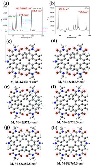 It can be seen that the distribution of TEDM is modified by the symmetry of the nitrogen atoms from the previous discussion. This is because the polarization rate and dipole moment have a direct correlation, and any alteration in the dipole moment will consequently affect Raman optical activity since it relies on the polarization rate. Next, the ROA of M, M-4 and M, M-5 are calculated (Figure 8a,b), and the vibrational modes are given. Visualizing the connection between molecular chirality and ROA spectrum is possible. By observing the vibrational modes, it is apparent that the asymmetry of the nitrogen atom alters the TEDM, leading to a change in the ROA spectrum. For the M, M-4 structure, the four peaks at 396.8 cm−1, 466.9 cm−1, 572.4 cm−1, and 776.5 cm−1 are relatively high. The peak at 461.9 cm−1 showed the highest activity and the hydrogen atom attached to the nitrogen atom exhibited an extremely strong vibrational intensity (Figure 8c). The distribution of all four vibrational modes is left-right asymmetric due to the variation of the electric dipole moment (Figure 8c–f). For the M, M-5 structure, the two peaks at 359.5 cm−1 and 767.3 cm−1 are the highest, and they also show activity in the ROA. At 359.5 cm−1, the four hydrogen atoms adjacent to the pyrrole vibrate in the upward direction (Figure 8g), but the four hydrogen atoms adjacent to the pyrrole at 767.3 cm−1 vibrate in the opposite direction (Figure 8h). As the TEDM is symmetric in the upward and downward direction, the change in TEDM causes the vibrational mode to become active.