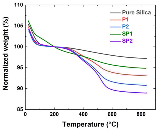 Normalized TGA curves of pure and plasma-treated silica.