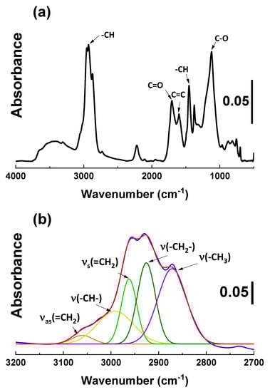 In Figure 3b, the 3100 and 2800 cm−1 regions are zoomed in and deconvoluted to identify the hydrocarbon structures. The black trace in the spectrum corresponds to the DAS-plasma-treated layer, while the color traces represent the individual peaks after deconvolution. Several hydrocarbon structures, including unsaturated C=C bonds, are detected in this region [9,18].