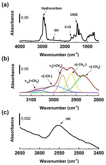 DRIFTs spectra of SP3, DAS-plasma treated layers: (a) full spectra; (b) selected region of DAS-plasma deposited layer, 3150~2800 cm−1 (black trace) and individual peaks after deconvolution (colored traces); (c) selected region, 2450~2650 cm−1, to identify the -SH moiety [18,20].
