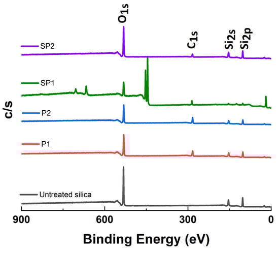 XPS results of untreated silica, SP1, and SP2 plasma-treated silica.