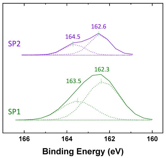 A higher carbon intensity was observed on the SP2 sample than on the SP1 one, resulting from a higher degree of modification by the acetylene-plasma treatment. Furthermore, sulfur atoms of DAS are detected in both samples, SP1 and SP2. SP1 showed a higher S content than SP2, as expected from the higher degree of DAS deposition and as shown in Figure 5, displaying high-resolution spectra of S2p that indicate the presence of two distinct sulfur species. One species is observed at a low Binding Energy (BE) of 162 eV, corresponding to bound sulfur (i.e., R-S-R). The BE for thiols is between 163 and 164 eV [22,23], which correlates well with the results from DRIFTs. No oxidized sulfur species, such as sulfonates (S2p BE > 166 eV), were detected by XPS on any of the samples [23].
