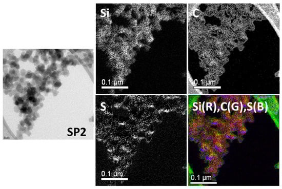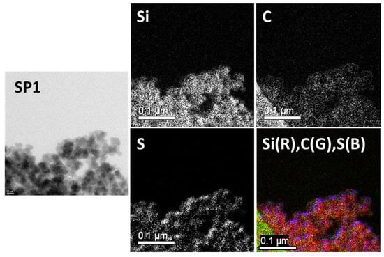 Figure 8 shows the results for Sample SP1: The carbon (C) and sulfur (S) elemental mapping showed a homogeneous distribution over the silica surface. In addition, the combined image shows that carbon and sulfur, as represented by green and blue colors, respectively, are distributed evenly over the silicon (Si) particles in red.