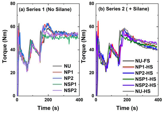 In Figure 10b, the compound NSP2-HS with 2.3 phr silane shows the highest mixing torque, followed by the compounds NU-HS, NP1HS, and NSP1-HS. The compound (NP2-HS), filled with silica P2 with a higher degree of plasma deposition and 2.3 phr of silane, exhibits similar final torque values compared to the in-situ modified reference compound with 4.5 phr of TESPD (NU-FS), the full amount.