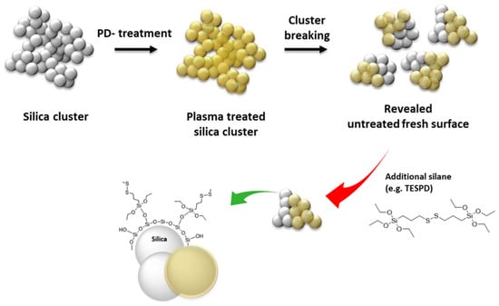It is known that commercially available pre-treated silica has the disadvantage of unmodified silica surfaces being revealed during the mixing process when silica clusters are broken into smaller units [15]. Therefore, an untreated surface of plasma-modified silica is created during the mixing process when the silica clusters break into smaller units. The hypothesis is that the additional silane coupling agent covered the exposed unmodified silica surface during the mixing process, as depicted in Figure 11. Therefore, introducing a silane coupling agent in the acetylene-PD silica-filled NR compounds might improve their processibility and properties. For P2, the addition of 50% TESPD resulted in a compound viscosity similar to the reference compound with 100% TESPD and in-situ modification.
